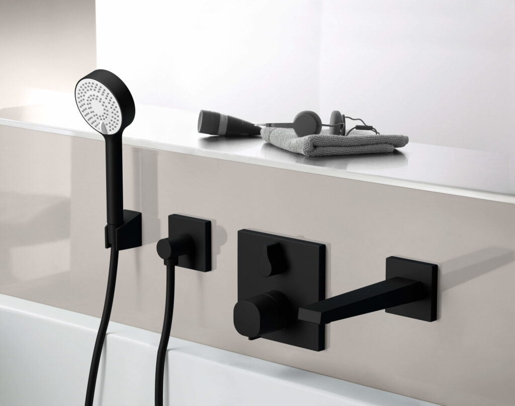 HANSA Matt Black Duschsystem: Waschtisch, Wanne, Dusche: Im Bad zieht sich der edle Farbton durch alle Bereiche. Hier: das HANSAMICRA Duschsystem. (Foto: Hansa Armaturen GmbH)